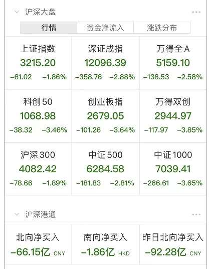 两市股指全线走低,盘中大幅单边下行,创业板指盘中大跌近4%;截至收盘,沪指跌1.86%报3215.2点,深成指跌2.88%报12096.39点,创业板指跌3.64%报2679.05点,科创50指数跌3.46%;两市合计成交11261亿元,北向资金净卖出66.15亿元。