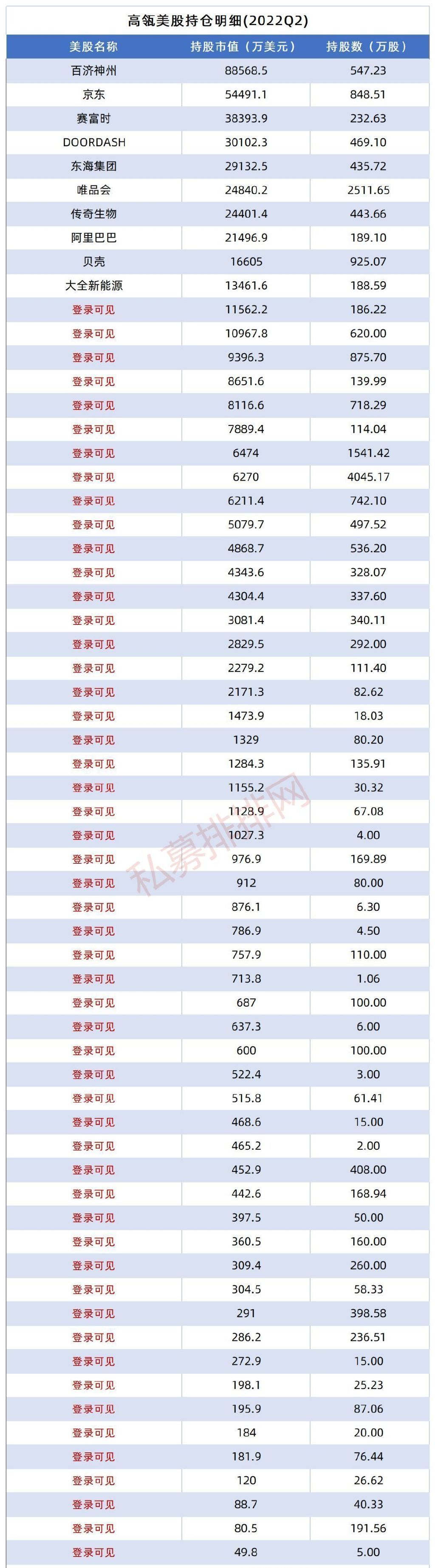 私募排排网统计数据显示,高瓴二季度持仓的前十大美股分别是百济神州、京东、赛富时、DoorDash、东海集团、唯品会、传奇生物、阿里巴巴、贝壳、大全新能源。