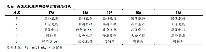 中原证券研报表示,2016-2019年晶科能源的光伏组件出货量全球第一,累计出货量超过100GW。不过,2021年其出货排名已下落至第四。