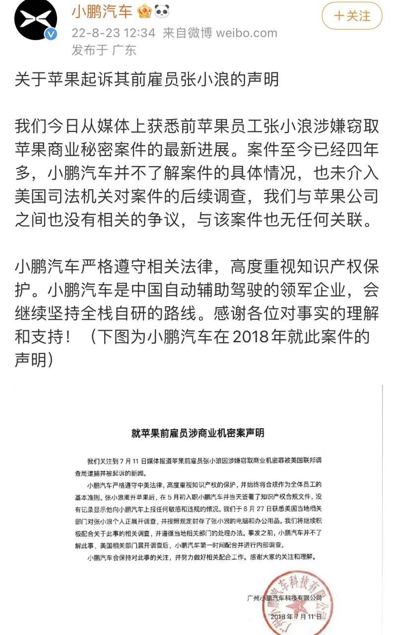 8月23日午间,小鹏汽车官方账号发布关于苹果起诉其前雇员张小浪的声明:我们今日从媒体上获悉前苹果员工张小浪涉嫌窃取苹果商业秘密案件的最新进展。案件至今已经四年多,小鹏汽车并不了解案件的具体情况,也未介入美国司法机关对案件的后续调查,我们与苹果公司之间也没有相关的争议,与该案件也无任何关联。小鹏汽车严格遵守相关法律,高度重视知识产权保护。小鹏汽车是中国自动辅助驾驶的领军企业,会继续坚持全栈自研的路线。感谢各位对事实的理解和支持!