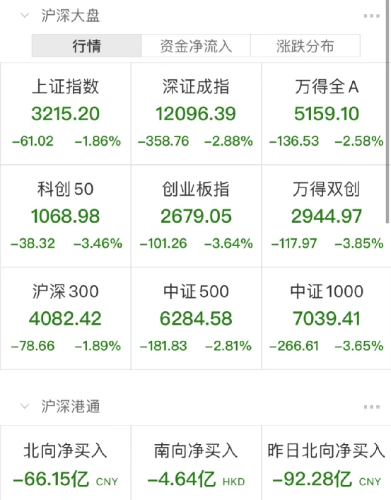 数据显示,上证指数收盘下跌1.86%,深证成指下跌2.88%,沪深300指数下跌1.89%,创业板指下跌3.64%,科创50下跌3.46%;今日沪深两市成交额11266亿,北上资金净流出66.15亿。
