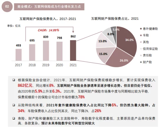 根据保险业协会统计,2021年互联网保险成为保险行业增长发力点,累计实现保费收入862亿元,同比增长8%。从险种结构来看,意外健康险市场需求较大,寿险数字化程度较低,预计未来寿险数字化可转型空间较大。