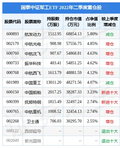 国泰中证军工ETF的前十大重仓股如下: