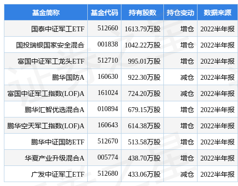 根据2022半年报公募基金重仓股数据,重仓该股的公募基金共65家,其中持有数量最多的公募基金为国泰中证军工ETF。国泰中证军工ETF目前规模为118.63亿元,最新净值1.2203(8月23日),较上一交易日下跌0.72%,近一年下跌13.18%。该公募基金现任基金经理为艾小军。艾小军在任的基金产品包括:国泰上证180金融ETF联接A,管理时间为2014年1月13日至今,期间收益率为76.03%;国泰上证180金融ETF,管理时间为2014年1月13日至今,期间收益率为84.66%;国泰黄金ETF,管理时间为2014年1月13日至今,期间收益率为51.32%;国泰中证计算机主题ETF联接A,管理时间为2015年3月26日至今,期间收益率为-21.54%。
