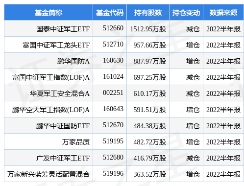 根据2022半年报公募基金重仓股数据,重仓该股的公募基金共73家,其中持有数量最多的公募基金为国泰中证军工ETF。国泰中证军工ETF目前规模为118.63亿元,最新净值1.2203(8月23日),较上一交易日下跌0.72%,近一年下跌13.18%。该公募基金现任基金经理为艾小军。艾小军在任的基金产品包括:国泰上证180金融ETF联接A,管理时间为2014年1月13日至今,期间收益率为76.03%;国泰上证180金融ETF,管理时间为2014年1月13日至今,期间收益率为84.66%;国泰黄金ETF,管理时间为2014年1月13日至今,期间收益率为51.32%;国泰中证计算机主题ETF联接A,管理时间为2015年3月26日至今,期间收益率为-21.54%。