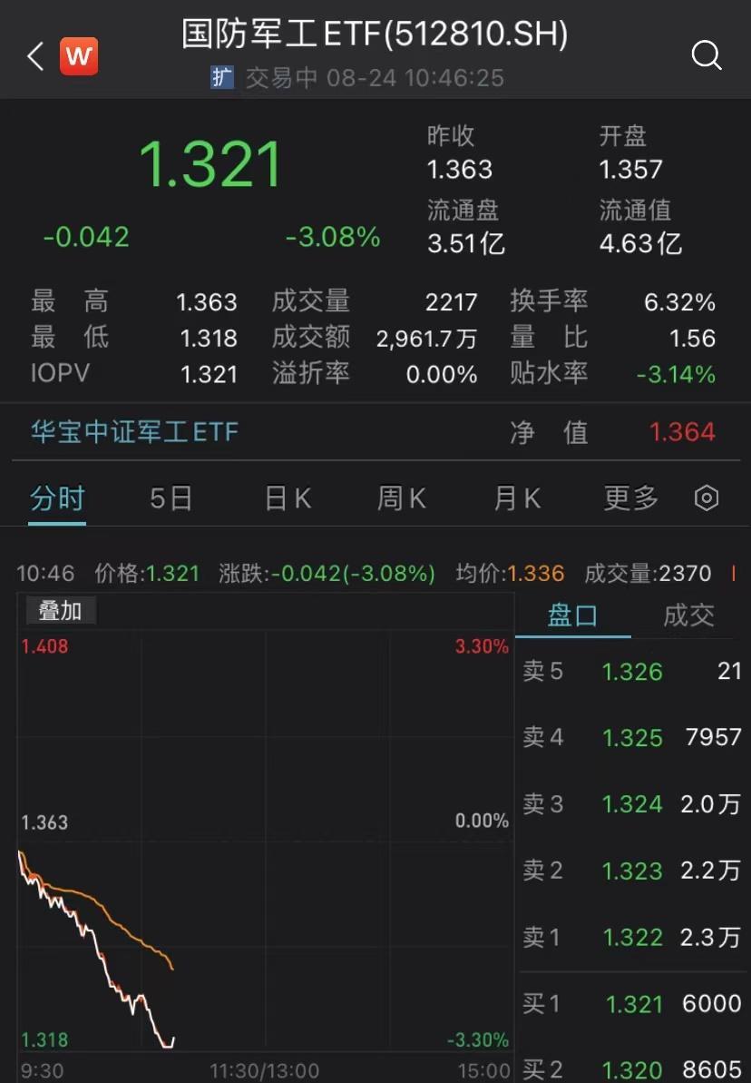 金融界8月24日早盘,三大指数集体走弱,国防军工板块跌幅居前。航天发展大跌近8%,钢研高纳、上海瀚讯均跌超6%,火炬电子、爱乐达、宏达电子等跌超5%。国防军工ETF(512810)跌超3%,成交额现超3000万元,换手率超6%。