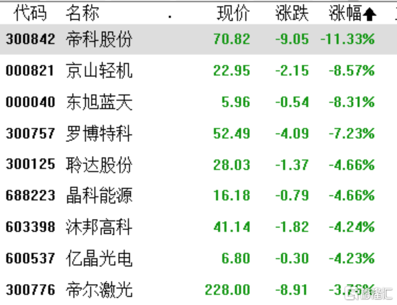 钙钛矿、TOPCon电池等板块跌幅居前,迪克股份跌超11%,京山轻机跌超8%,杭萧钢构跌超6%,金晶科技跌超5%,爱康科技、隆华科技、晶科能源、沐邦高科、亿晶光电跌超4%,帝尔激光、中来股份、捷佳伟创跌超3%。