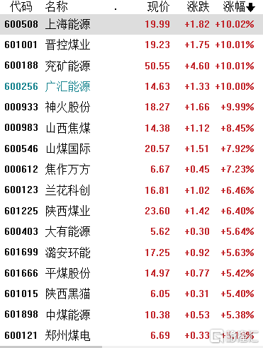 煤炭股大涨,上海能源、晋控煤业、兖矿能源、神火股份涨停,山西焦煤涨超8%,焦作万方、山煤国际涨超7%,陕西煤业、兰花科创涨超6%,中煤能源、潞安环能、平煤股份、陕西黑猫等涨超5%。