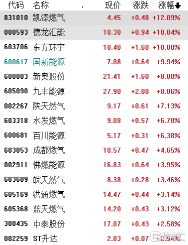 燃气股表现活跃,德龙汇能、东方环宇、国新能源涨停,新奥能源、九丰能源涨超8%,百川能源、水发燃气涨超6%,成都燃气涨超4%,佛燃能源等跟涨。