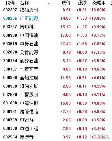 石油股领涨,淮油股份、广汇能源涨停,中国海油涨超8%,贝肯能源、中曼石油涨超7%,中海油服、仁智股份、海油发展等涨超4%。