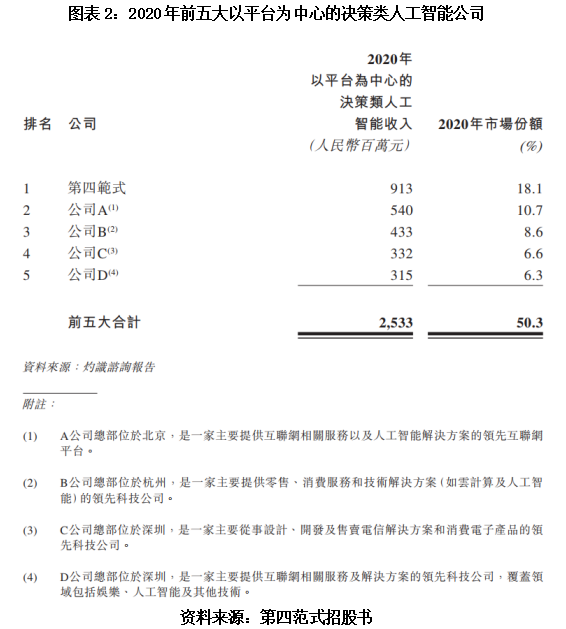 根据灼识咨询统计,第四范式是国内最大的以平台为中心的决策类人工智能提供商,2020年市场份额为18.1%,前五大参与者合计占据50.3%的市场份额。