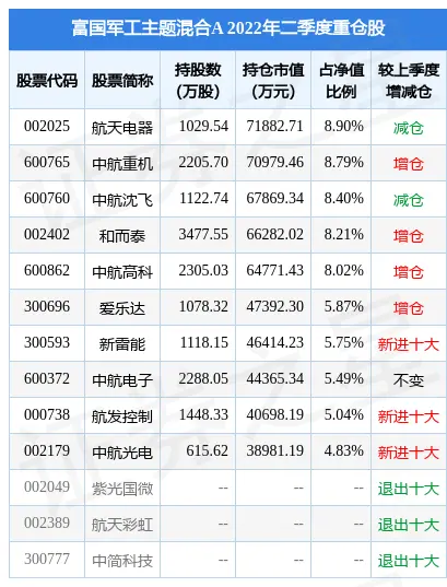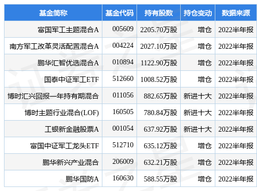 根据2022半年报公募基金重仓股数据,重仓该股的公募基金共151家,其中持有数量最多的公募基金为富国军工主题混合A。富国军工主题混合A目前规模为70.68亿元,最新净值1.9745(8月26日),较上一交易日下跌1.95%,近一年下跌16.12%。该公募基金现任基金经理为章旭峰。章旭峰在任的基金产品包括:富国产业升级混合A,管理时间为2017年6月9日至今,期间收益率为136.05%;富国国家安全主题混合A,管理时间为2020年7月30日至今,期间收益率为-0.55%。