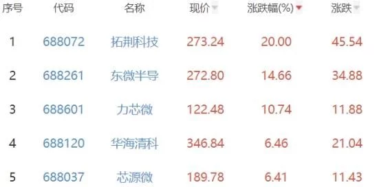 其中,拓荆科技、东微半导、力芯微、华海清科、芯源微位列板块涨幅前五位,涨幅分别为20.00%、14.66%、10.74%、6.46%、6.41%。