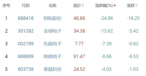 恒烁股份、金禄电子、东晶电子、明微电子、泰晶科技位列涨幅榜后五位,涨幅分别为-24.96%、-13.62%、-7.39%、-6.66%、-4.03%。