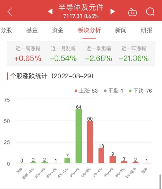 中国经济网北京8月29日讯 今日,半导体及元件板块整体涨幅0.65%,其中83只股票上涨,1只股票平盘,76只股票下跌。