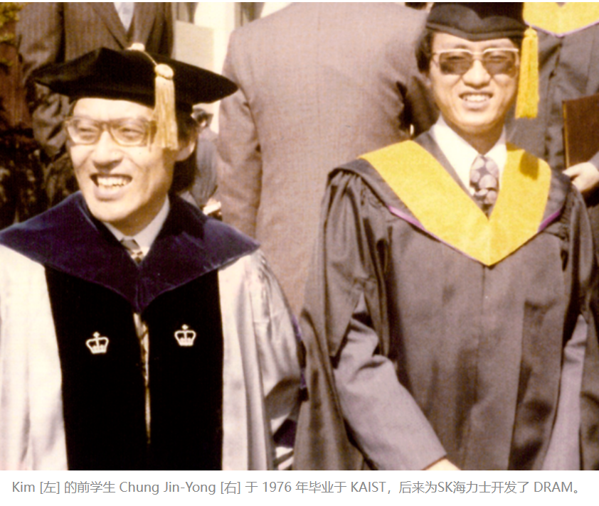 KAIST 的毕业生涌向三星、金星/LG 和现代/海力士。随着政府影响力的下降,一些在政府研究机构工作的第一期校友也进入了公司工作。与此同时,越来越多的Kim以前的学生接受了大学教授的职位。例如,在 1991 年离开 Kim 的实验室后,Cho Byung-Jin 在现代汽车公司花了四年时间开发 DRAM 和闪存,之后成为新加坡国立大学和 KAIST 的明星教授。Kim 的第一位博士生 Kyung Chong-Min 于 1983 年加入 KAIST 的教师;到 2018 年退休时,Kyung 培训的半导体专家比 Kim 本人还多。