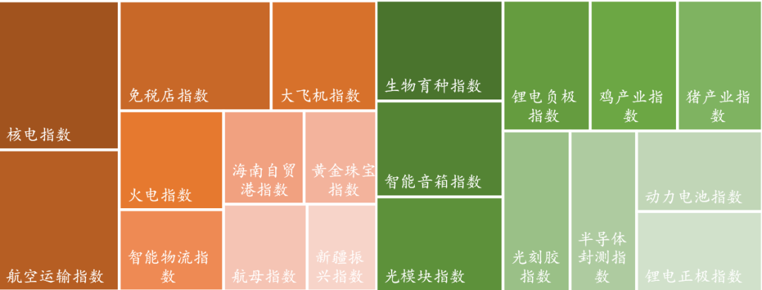 数据来源:Wind,东海基金整理。注:橘色上涨、绿色下跌。行业表现:半导体、苹果、锂电池、机器人题材下挫