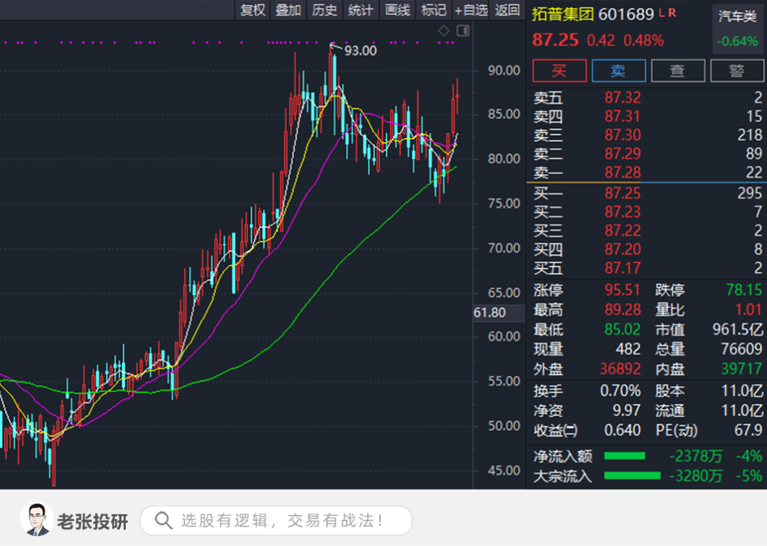 在当前存量市场博弈中,市场每次的调整都会是一场大洗牌,但有逻辑的优质品种依然会是牌面上最亮的仔,会受到一波接着一波资金的偏爱。有逻辑的品种,每次跟随市场的调整都是黄金坑,就像张家圈跟踪的拓普。