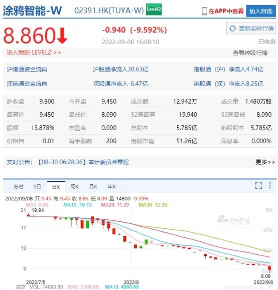 中国经济网北京9月8日讯 今日,港股涂鸦智能(02391.HK)股价下跌,盘中最低报8.09港元,创新低。截至港股收盘,该股报8.86港元,跌幅9.592%,港股市值51.26亿港元。