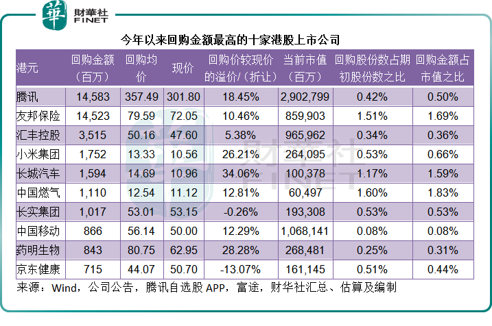 回购额度最高的10家港股上市公司合共回购金额达到405.17亿港元,占了期内港股市场总回购金额的81.21%,其中腾讯和友邦保险两家合起来占了近60%。