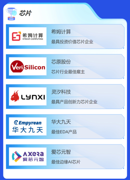 芯片领域,希姆计算荣获最具投资价值芯片企业奖,芯原股份荣获芯片行业最佳雇主奖,灵汐科技荣获最具产品创新力芯片企业奖,华大九天荣获最佳EDA产品奖,爱芯元智荣获最佳边缘AI芯片奖。