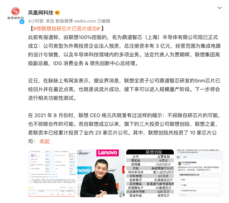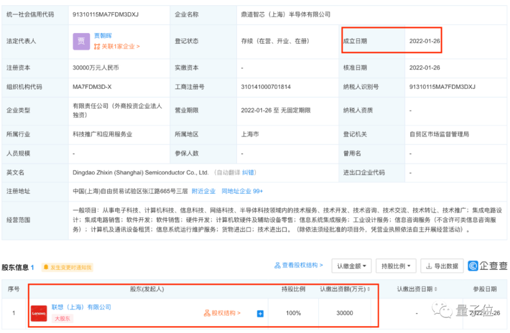 据了解鼎道智芯(上海)半导体有限公司是由联想100%控股的,成立于2022年1月26日。公司类型为外商投资企业法人独资,总注册资本有3亿元,经营范围为集成电路的设计与销售,以及半导体科技领域内的多项业务。法定代表人为贾朝晖——联想集团高级副总裁,IDG消费业务&领先创新中心总经理。