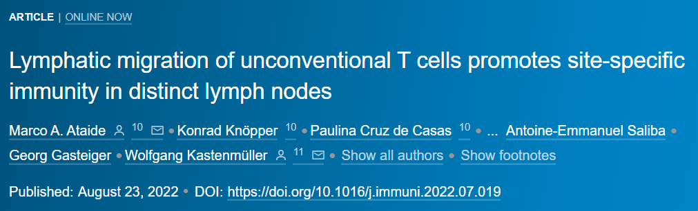 [2] Ataide MA, Knöpper K, Cruz de Casas P, Ugur M, Eickhoff S, Zou M, Shaikh H, Trivedi A, Grafen A, Yang T, Prinz I, Ohlsen K, Gomez de Agüero M, Beilhack A, Huehn J, Gaya M, Saliba AE, Gasteiger G, Kastenmüller W. Lymphatic migration of unconventional T cells promotes site-specific immunity in distinct lymph nodes. Immunity. 2022 Aug 17:S1074-7613(22)00354-5. doi: 10.1016/j.immuni.2022.07.019. Epub ahead of print. PMID: 36002023.