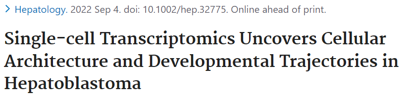 [1] Huang H, Wu L, Lu L, Zhang Z, Qiu B, Mo J, Luo Y, Xi Z, Feng M, Wan P, Zhu J, Yu D, Wu W, Tan K, Liu J, Sheng Q, Xu T, Huang J, Lv Z, Tang Y, Xia Q. Single-cell Transcriptomics Uncovers Cellular Architecture and Developmental Trajectories in Hepatoblastoma. Hepatology. 2022 Sep 4. doi: 10.1002/hep.32775. Epub ahead of print. PMID: 36059151.
