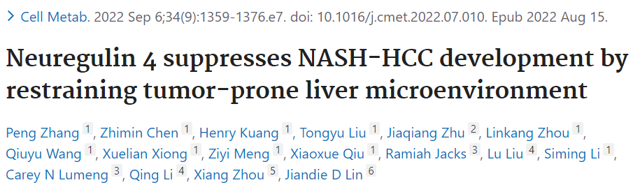 [4] Zhang P, Chen Z, Kuang H, Liu T, Zhu J, Zhou L, Wang Q, Xiong X, Meng Z, Qiu X, Jacks R, Liu L, Li S, Lumeng CN, Li Q, Zhou X, Lin JD. Neuregulin 4 suppresses NASH-HCC development by restraining tumor-prone liver microenvironment. Cell Metab. 2022 Sep 6;34(9):1359-1376.e7. doi: 10.1016/j.cmet.2022.07.010. Epub 2022 Aug 15. PMID: 35973424; PMCID: PMC9458631.
