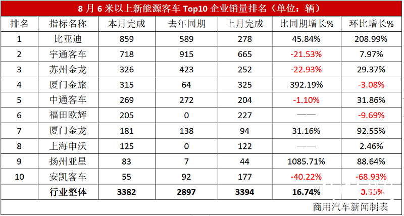 比亚迪从7月的第四名一跃冲上8月第一,共销售新能源客车859辆,同比增长45.84%,环比增长208.99%,是8月环比涨幅最大的企业。