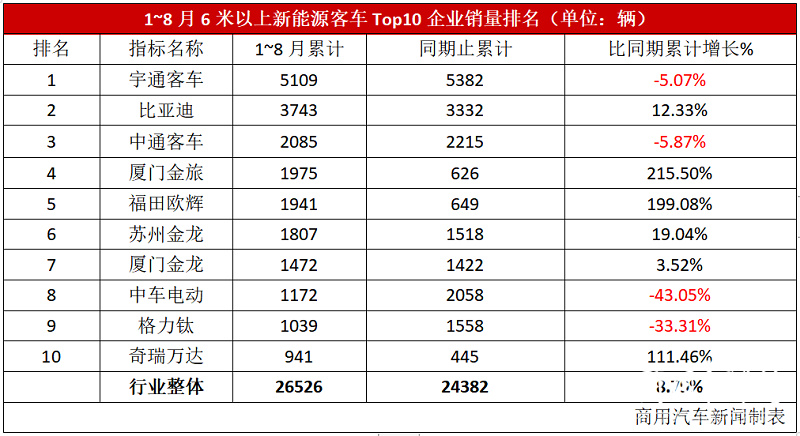 今年前8月,客车市场整体环境欠佳,新能源客车市场的表现虽无过多亮眼之处,但却保持了稳定增长。在此前提下,Top10企业排名则经常生变,企业间的竞争分外激烈。如今,三季度马上就要过去,6米以上新能源客车市场能否继续稳中向前?商用汽车新闻传媒将持续关注。