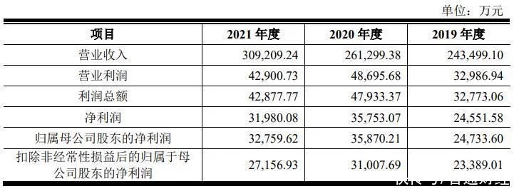 财务方面,于2019年度、2020年度及2021年度,公司营业收入约为24.35亿元、26.13亿元、30.92亿元;同期,公司归属母公司股东的净利润分别约为2.47亿元、3.59亿元、3.28亿元。