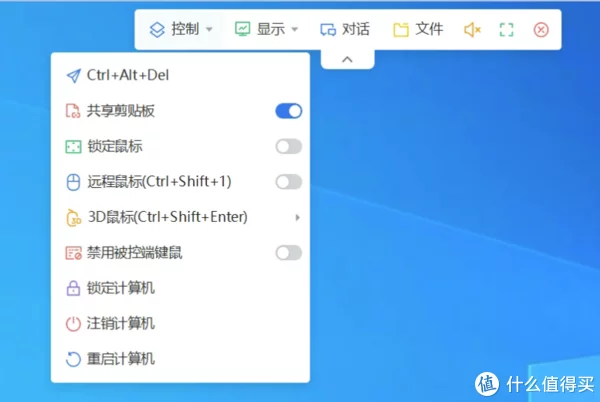 跨设备跨系统的使用方式都差不多,电脑连电脑主控电脑顶部会显示一个菜单栏,包括动作、查看、语音沟通、文字聊天、文件传输等功能,基本上远程环境下的需求都考虑在内了。
