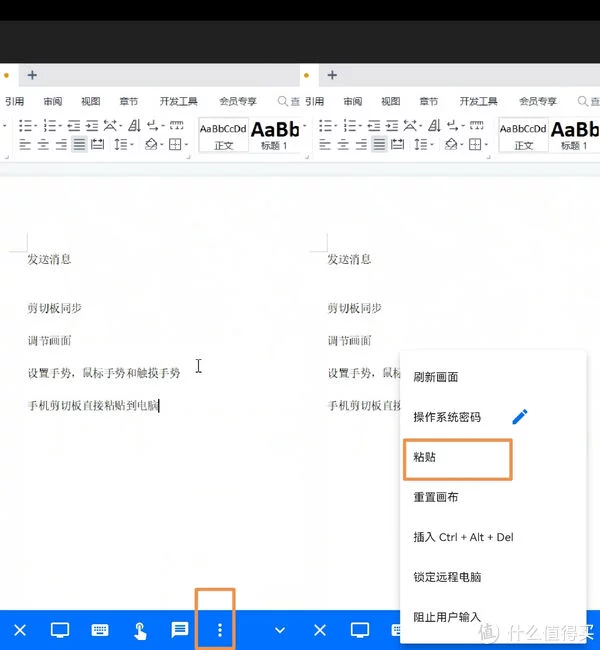 连接之后,还可以实现直接用手机复制文本至电脑端。方法是点击手机右下角三个点,在弹出窗口中选择粘贴,输入方面,RustDesk也支持用手机键盘输入至电脑端。