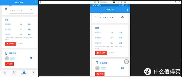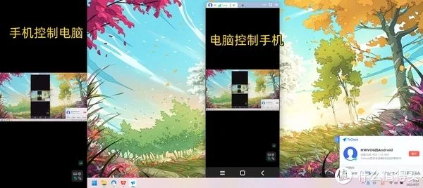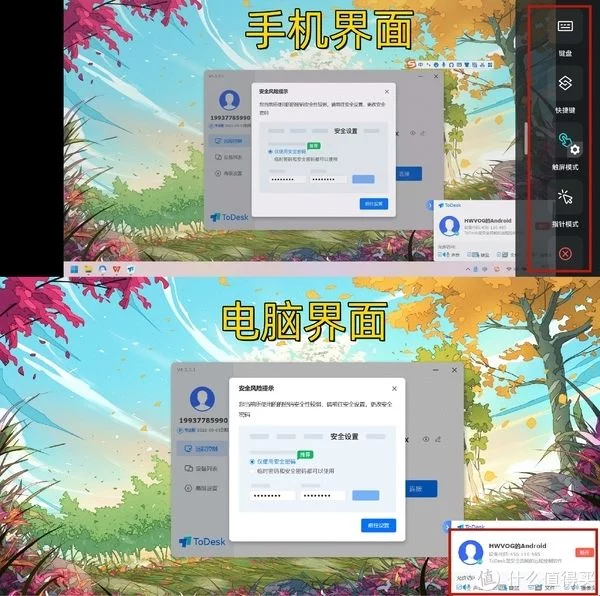 此外,ToDesk还支持两台设备同时控制对方,只需要按正常方式分别开启远程控制即可。下面就是手机、电脑同时开启了远程控制的画面。