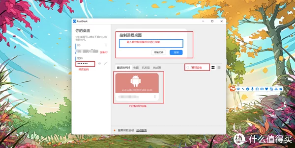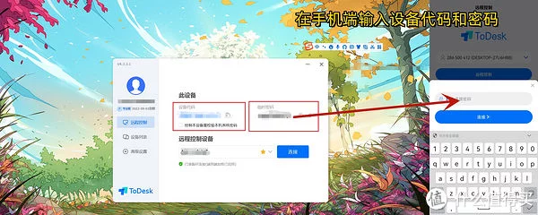 首先在电脑端设置好设备代码和密码,密码可以在设置中选择长期的还是临时的。设置好之后,在手机端输入设备代码,点击远程控制,输入密码,即可同步电脑屏幕,可以直接在手机上操控。