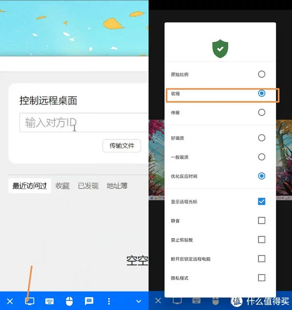 方法不难,点击手机窗口下方的电脑图标,在弹出的界面中选择收缩即可。另外就是界面没有横屏选项,所以如果想手机全屏查看电脑画面,需要把手机设置成自动旋转屏幕,然后横屏。