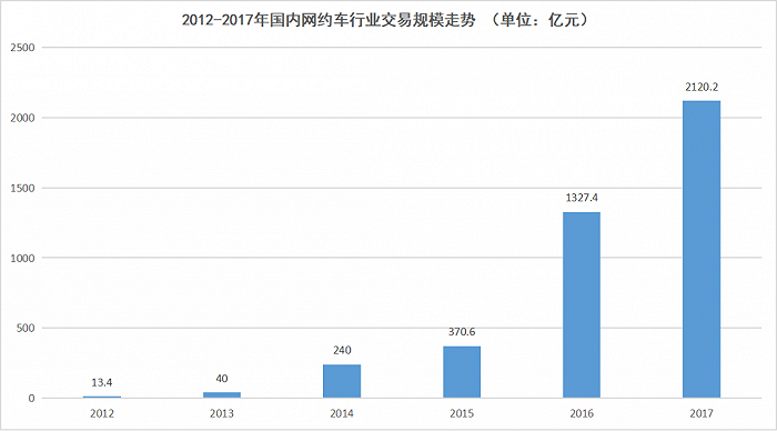 随着这些玩家的入局,整个网约车市场也步入快速发展期中。根据前瞻产业研究院数据显示,2017年国内网约车行业交易规模达到了2120.2亿元,而2015年这一数据仅为370.6亿元,两年时间几乎增长了5倍之多。