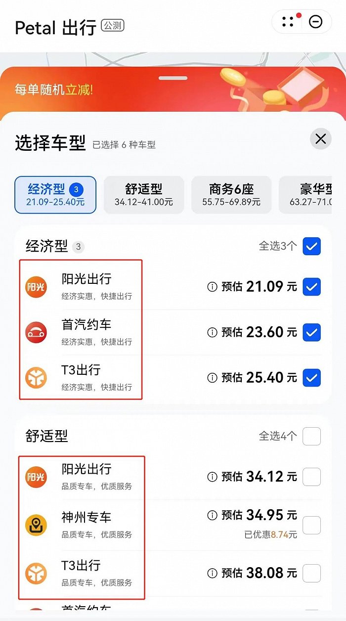 与其他网约车软件相同,随意在Petal出行中输入出发点和目的地后,随即弹出了车型和价格的选择界面。