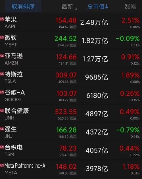 大型科技股多数上涨。苹果涨2.51%,特斯拉、英伟达、脸书母公司META涨超1%,亚马逊涨0.91%,谷歌、台积电小幅上涨。微软股价连续3日下跌,录得2021年5月后的新低,总市值约1.82万亿美元。