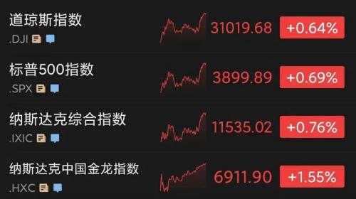 当地时间周一,美股三大指数集体收涨,结束上周跌势。道指涨0.64%,标普500指数涨0.69%,纳指涨0.76%。