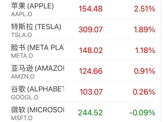 大型科技股多数收涨,特斯拉涨1.89%,微软微跌0.09%,谷歌涨0.26%,亚马逊涨0.9%,苹果涨2.5%,Meta涨1.18%。