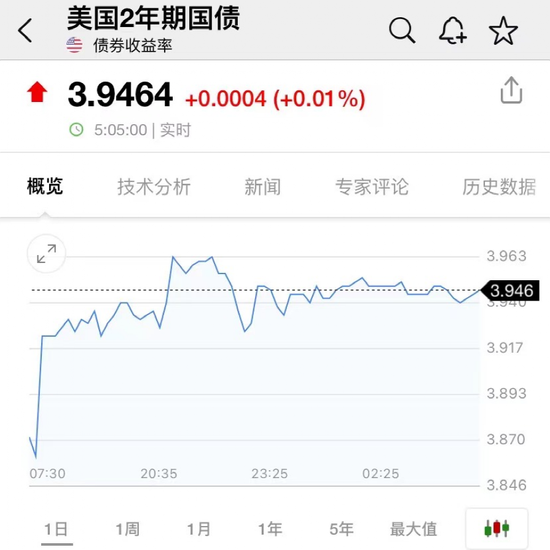 两年期美债收益率盘中跳涨9个基点,至3.95%,为2007年以来最高,目前位于3.9464附近。