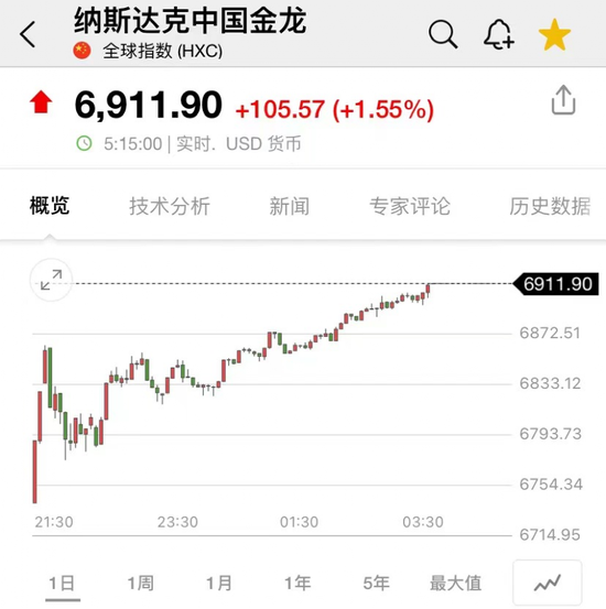 热门中概股多数上涨,纳斯达克金龙指数涨1.5%,收于6911点。