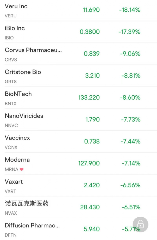 美股抗疫概念股大幅下跌,Veru跌超18%,Vaccinex跌超7.4%,巨头Moderna跌超7%,诺瓦瓦克斯医药跌超6%,辉瑞公司下跌1.3%。