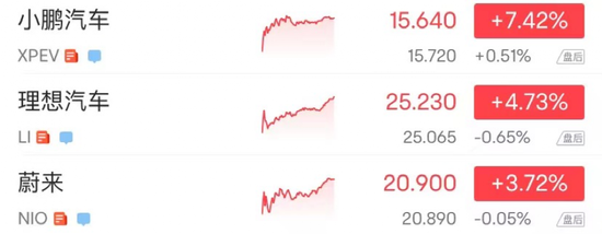 新能源汽车三巨头齐收涨。小鹏汽车涨7.42%,理想汽车涨4.73%,蔚来涨3.72%。