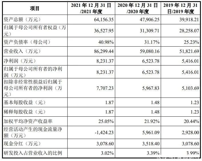 财务方面,唯特偶于2019年度、2020年度及2021年度,实现营业收入分别为5.18亿元、5.91亿元及8.63亿元,净利润分别为5416.01万元、6523.78万元、8231.37万元。同期,研发投入占营业收入的比例分别为3.99%、3.39%、3.02%。