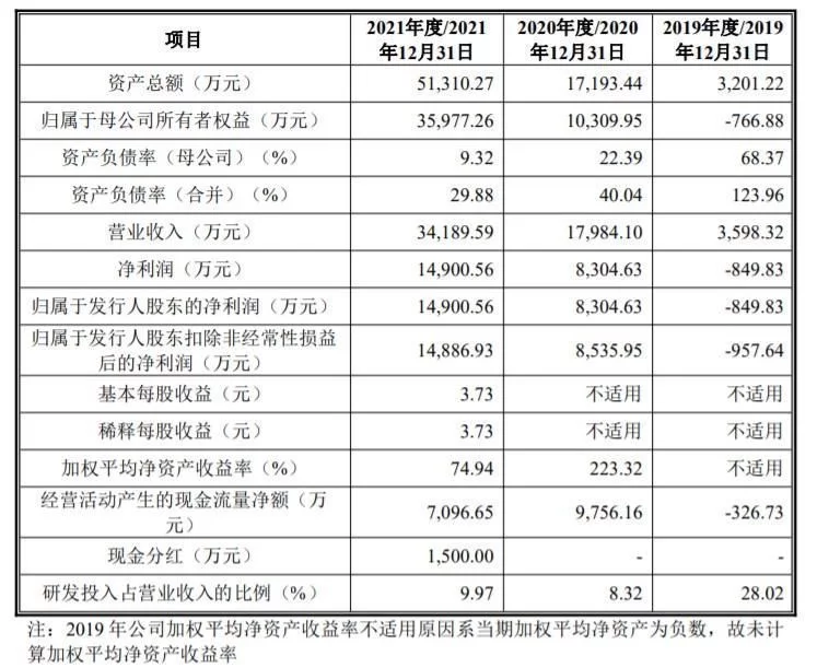 财务方面,于2019年度、2020年度及2021年度,近岸蛋白分别实现营业收入3598.32万元、1.80亿元及3.42亿元;同期,归属于发行人股东扣除非经常性损益后的净利润分别为-957.64万元、8535.95 万元及1.49亿元。其中,研发投入占营业收入的比例分别为28.02%、8.32%、9.97%。