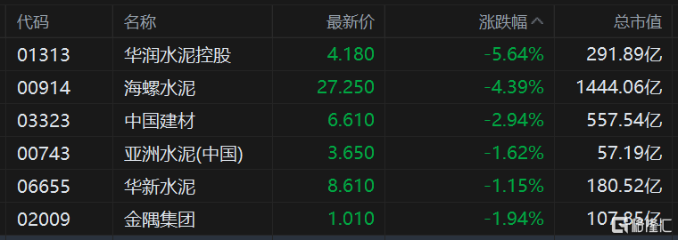 格隆汇9月21日丨港股水泥股持续下跌,华润水泥现跌5.6%,录得4连跌并刷新阶段低价,海螺水泥跌超4%,中国建材跌3%,亚洲水泥、华新水泥跟跌。