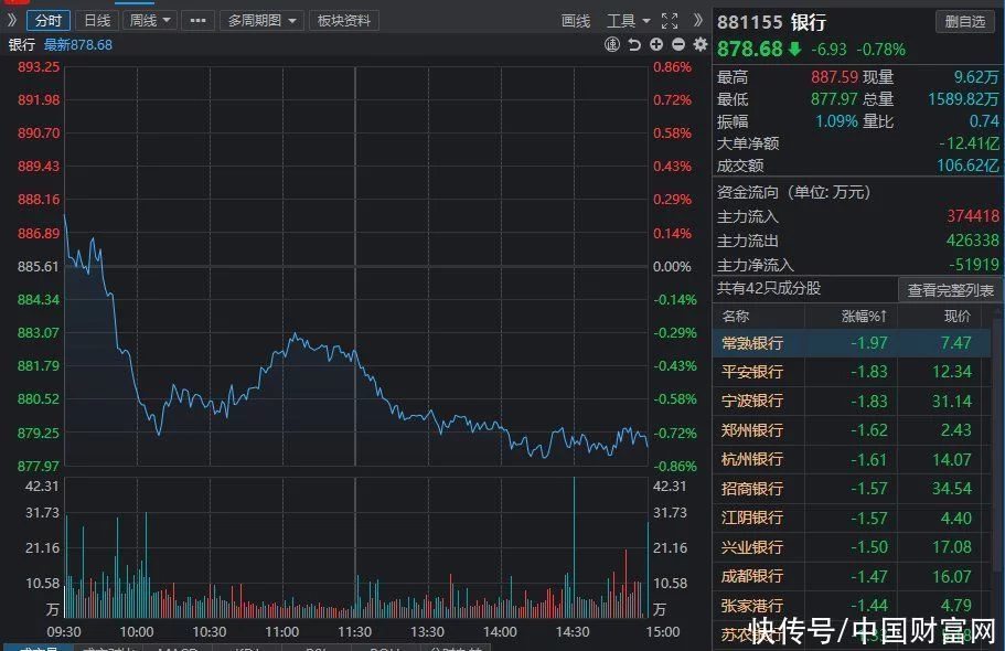 然而券商、银行、房地产等权重股飘绿,其中银行板块领跌,全天跌幅0.78%,常熟银行、江阴银行、宁波银行等个股盘中跌超2%,平安银行、招商银行等跌幅居前。